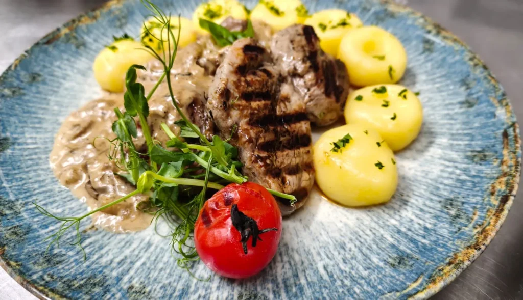 Polędwiczka souvide z sosem borowikowym z kluskami śląskimi i buraczkami