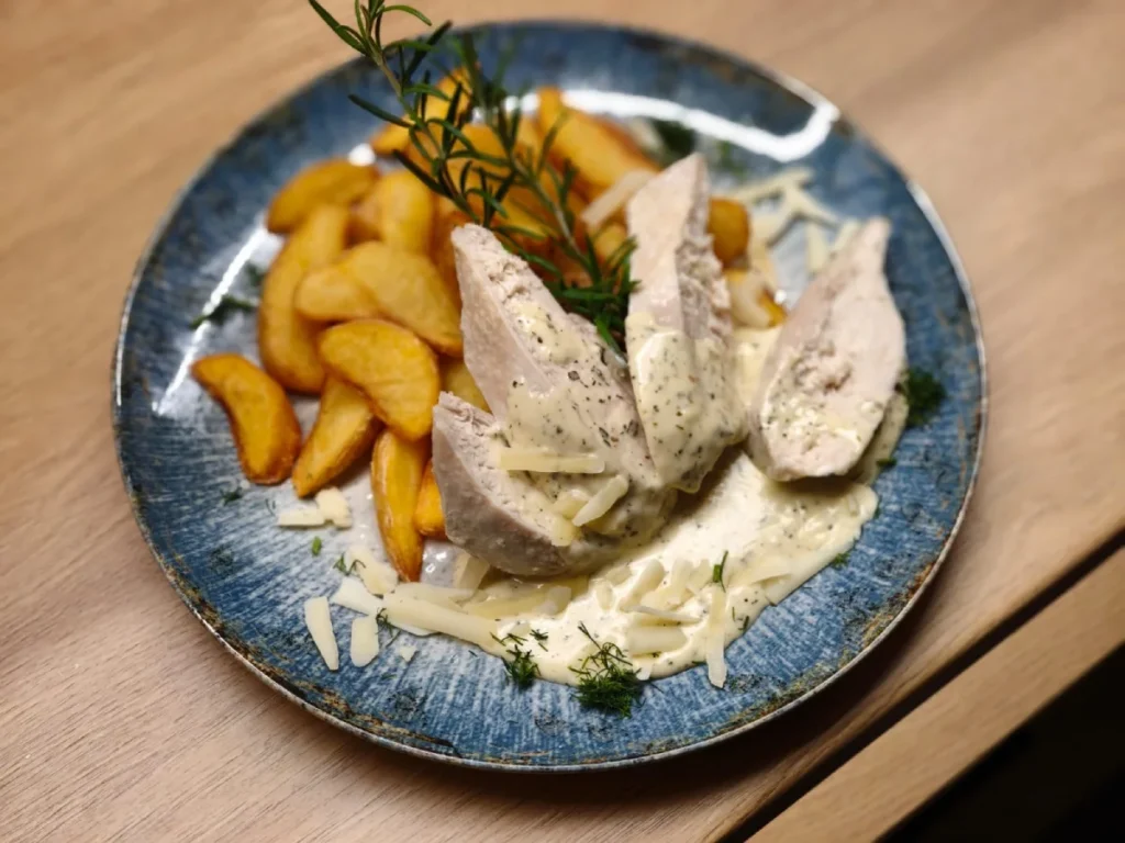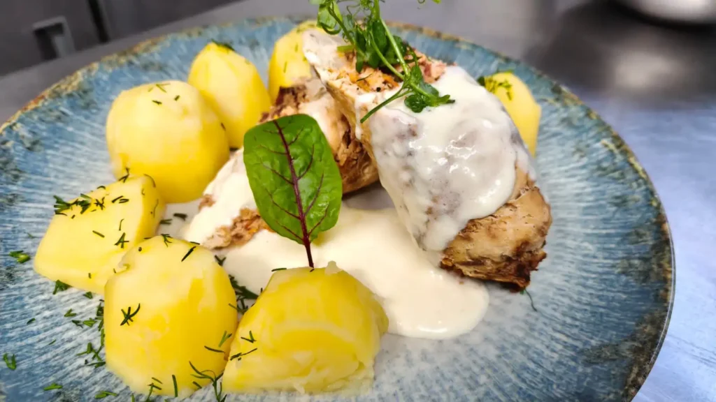 Pierś supreme w sosie ziołowym z ziemniakami z koperkiem i bukietem warzyw