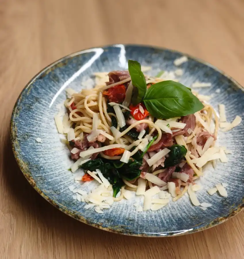 Spaghetti z szynką parmeńską (świeży szpinak, cebula, czosnek, pomidory koktajlowe)