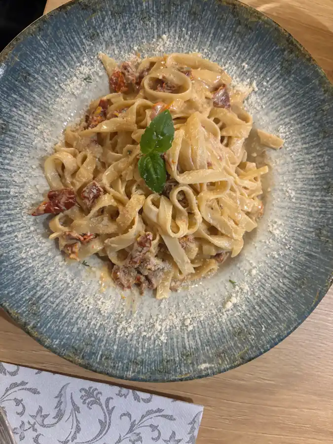 Tagliatelle z serem gorgonzola (śmietana, suszone pomidory, czosnek)