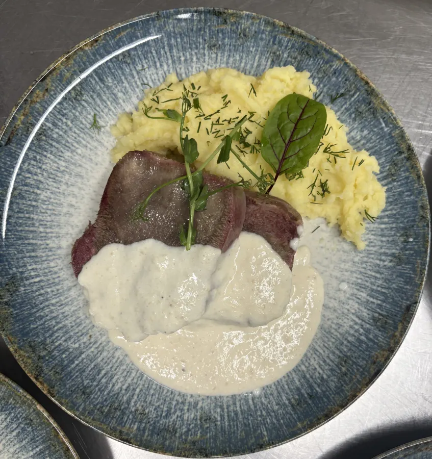 Ozory wołowe w sosie chrzanowym, puree i surówka z kapusty kiszonej