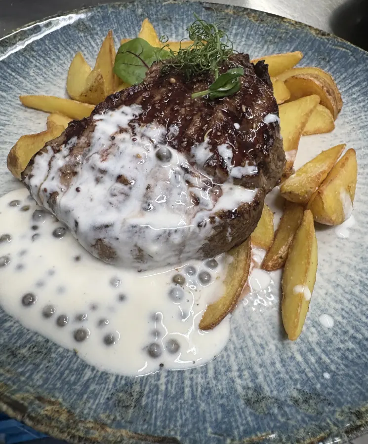 Stek z polędwicy wołowej z ziemniakami country i mixem sałat