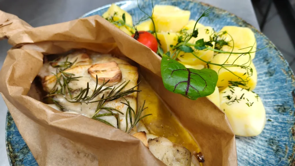 Dorsz w papilotach z ziemniakami z koperkiem i bukiet warzyw
